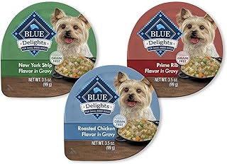 Blue Buffalo Delights Natural Adult Small Breed Wet Dog Food Cups, in Gravy, Chicken, Prime Rib and NY Strip 3.5-oz (24 Pack- 8 of Each Flavor)